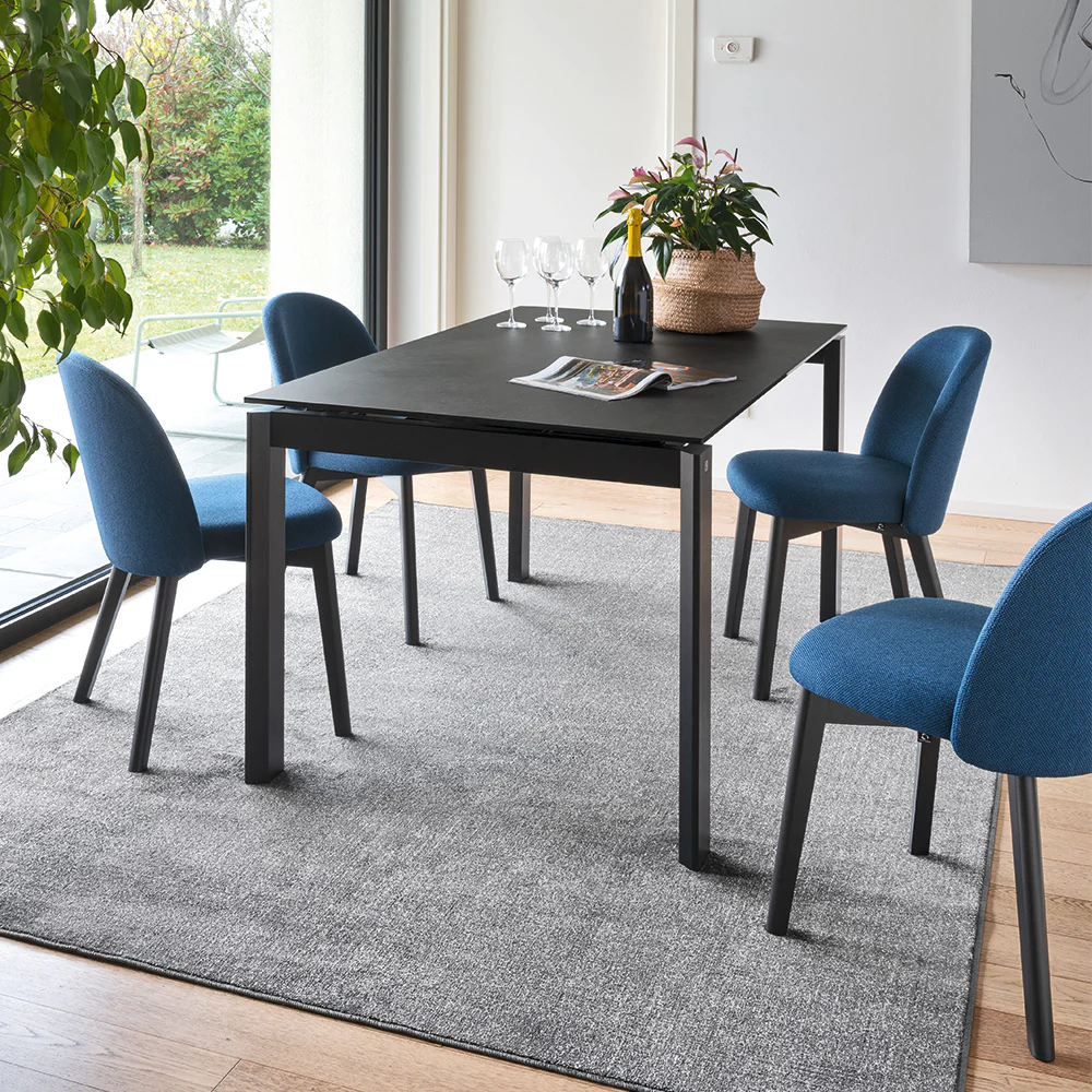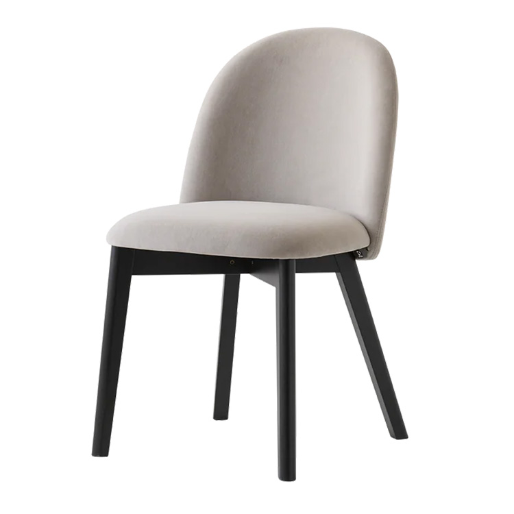 Sedia TUKA con 4 gambe in legno di faggio. Scocca imbottita e tappezzata fissa con schienale avvolgente e sedile arrotondato.